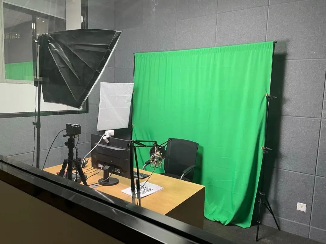 在直播间里,带柔光罩的大功率补光灯必不可少,在主播正前方和侧45°打光,可以让主播的脸部看起来柔和细腻。绿幕用来抠像,设置虚拟背景。还有桌面和落地手机支架、麦克风悬臂支架、相机三脚架等设备。