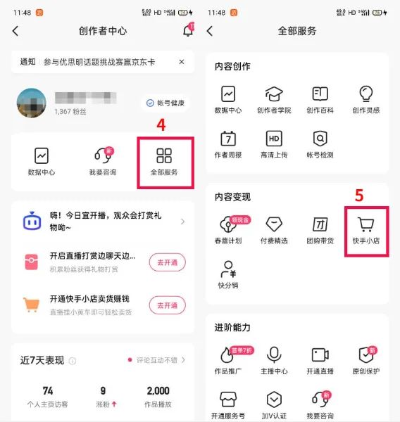 其次,点击【全部服务】,在“内容变现”里选择【快手小店】,操作如下: