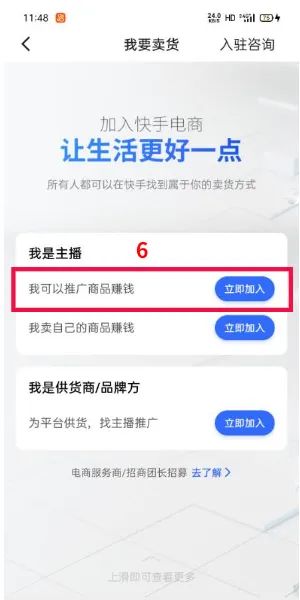然后,在“我是主播”里选择【我可以推广商品赚钱】,点击【立即加入】,操作如下: