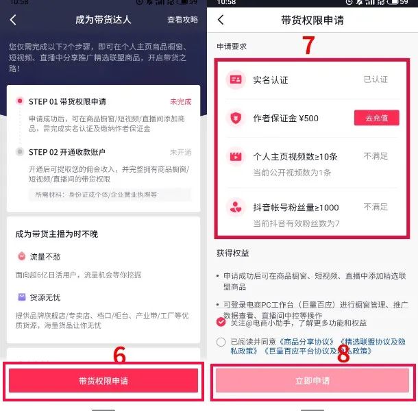 最后,在成为带货达人里,查看申请说明,分为两步:第一、带货权限申请,第二、开通收款账户。了解清楚后,点击【带货权限申请】按钮,会看到带货权限申请的具体要求,按申请要求一一去完成,最后点击【立即申请】,提交后等待审核,最快当天即可审核完成。操作如下: