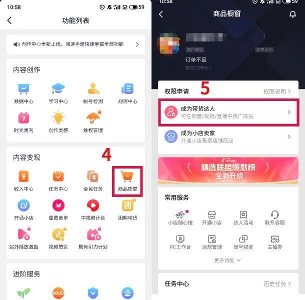 其次,在“内容变现”里选择【商品橱窗】,然后在“权限申请”里选择【成为带货达人】,操作如下: