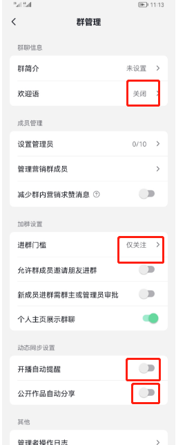 注意事项:开启群禁言,关闭自动欢迎,关闭开播自动分享,作品自动分享。