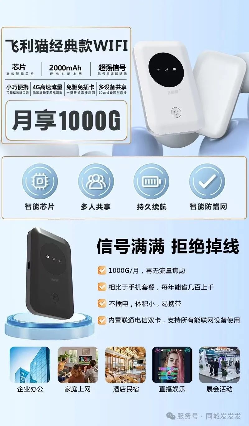 飞利猫综合管理平台是一个不错的随身wifi商城,经过改版后不仅系统更好用,而且发布的产品也是经过重新定版的,其中随身wifi产品不仅流量资费便宜,而且包含的流量还更多,其中的爆款就是9元1000G流量